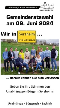 Damit, und mit den engagierten, in Sersheim verankerten Kandidatinnen und Kandidaten bieten wir den Wählerinnen und Wählern ein attraktives Angebot für die Gemeinderatswahl, mit dem wir die Aufgaben und Herausforderungen in Sersheim meistern können – stets Unabhängig, Bürgernah und Sachlich.