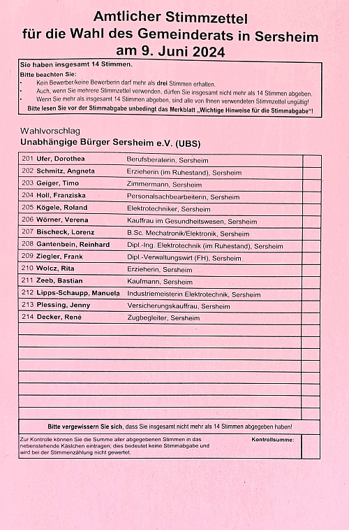 [Juni 2024] So sieht der Stimmzettel zur Gemeinderatswahl für die Liste der Unabhängigen Bürger Sersheim (UBS) aus. Ihr könnt maximal 14 Stimmen vergeben – am besten alle 14 Stimmen auf dem UBS-Stimmzettel.